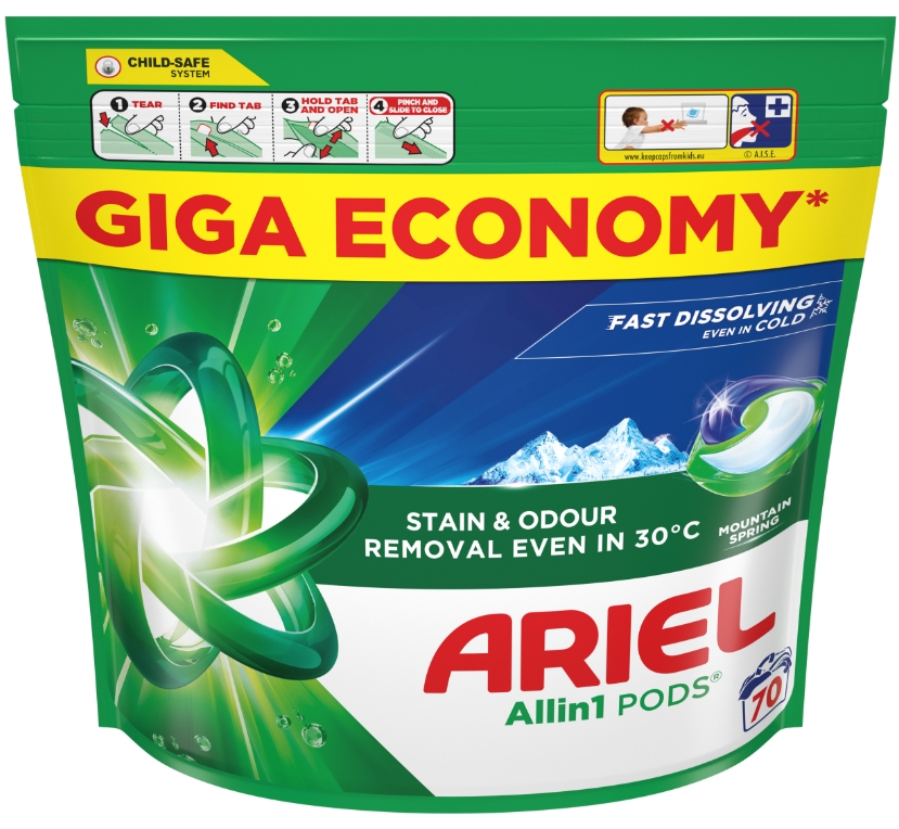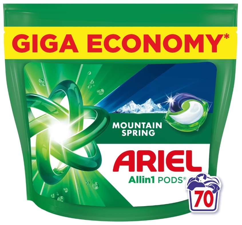 Ariel All-in-1 Mountain Spring to innowacyjne kapsułki do prania przeznaczone do tkanin białych i jasnych. Dzięki zaawansowanej formule z technologią Cool Clean, skutecznie usuwają nawet trudne zabrudzenia już w niskich temperaturach, Kapsułki Ariel do białych i jasnych tkanin skutecznie usuwają plamy, pielęgnują ubrania i nadają im świeży zapach czystości.