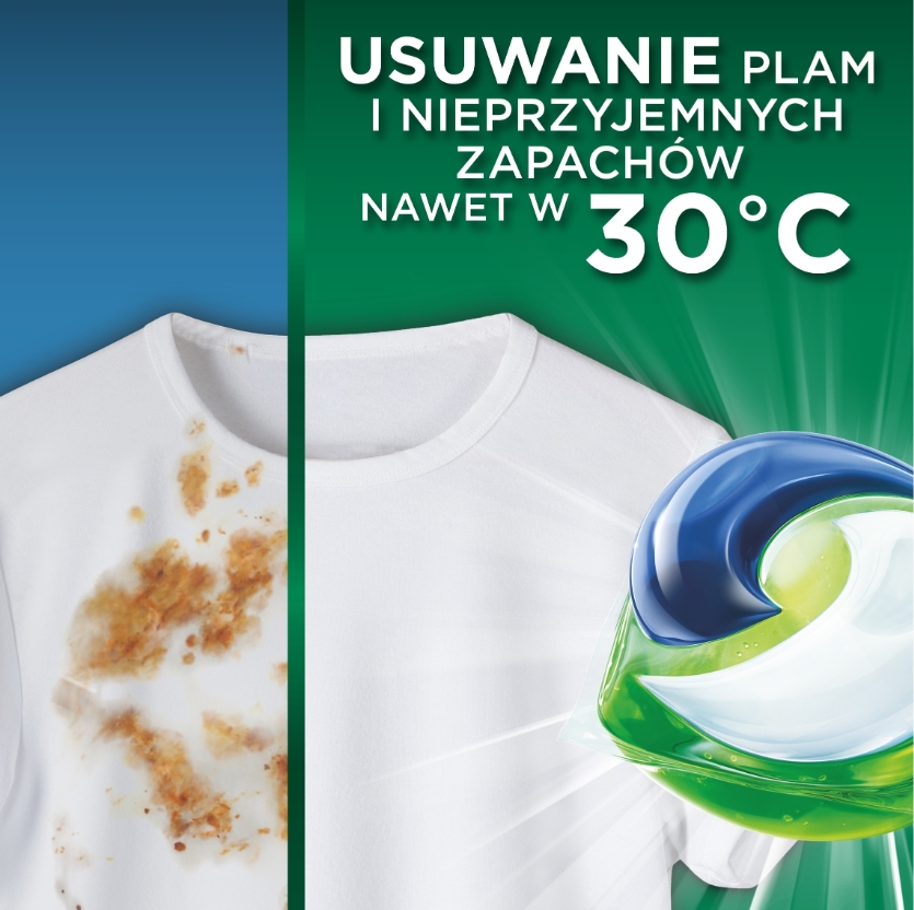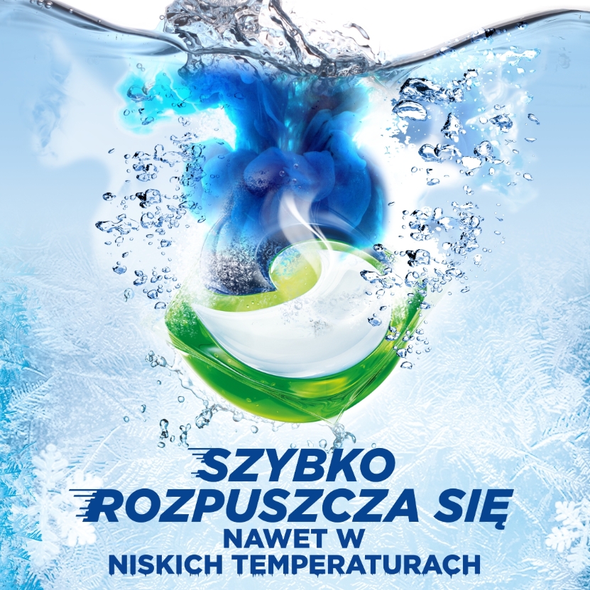 Zintegrowany detergent piorący aktywuje się natychmiast po kontakcie z wodą, zapewniając pełną moc czyszczenia i długotrwały, świeży zapach Mountain Spring. Kapsułki są w 100% rozpuszczalne, co sprawia, że są wygodne i bezpieczne w użyciu – bez konieczności dozowania płynów czy proszków.