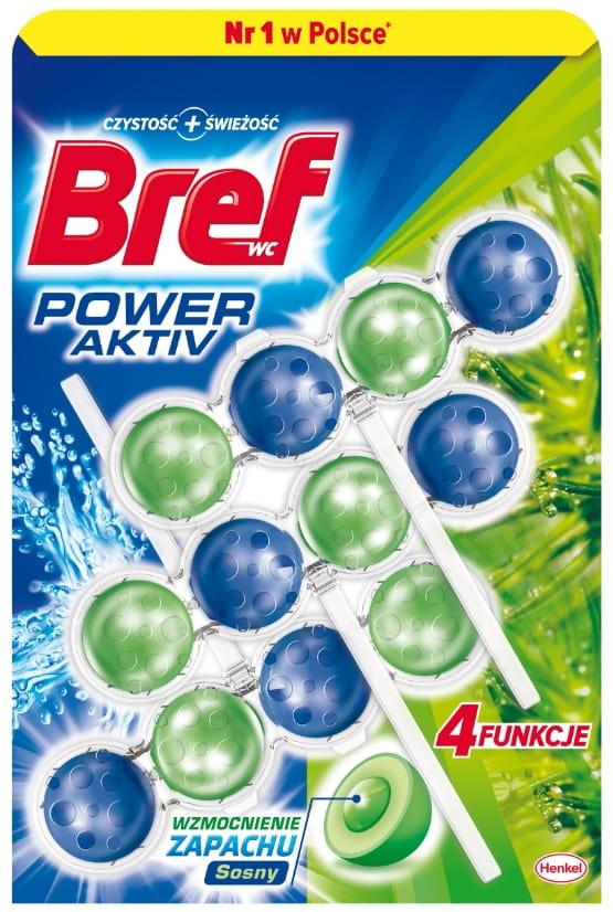 Innowacyjna formuła Bref Power Aktiv spełnia 4 funkcje, które zawarte są w dyskretnym i nowoczesnym opakowaniu. Nowa generacja kostek do toalet hamuje osadzanie się kamienia i pomaga utrzymać toaletę czystą i świeżą poprzez połączenie ochrony przed zabrudzeniami i extraświeżości.