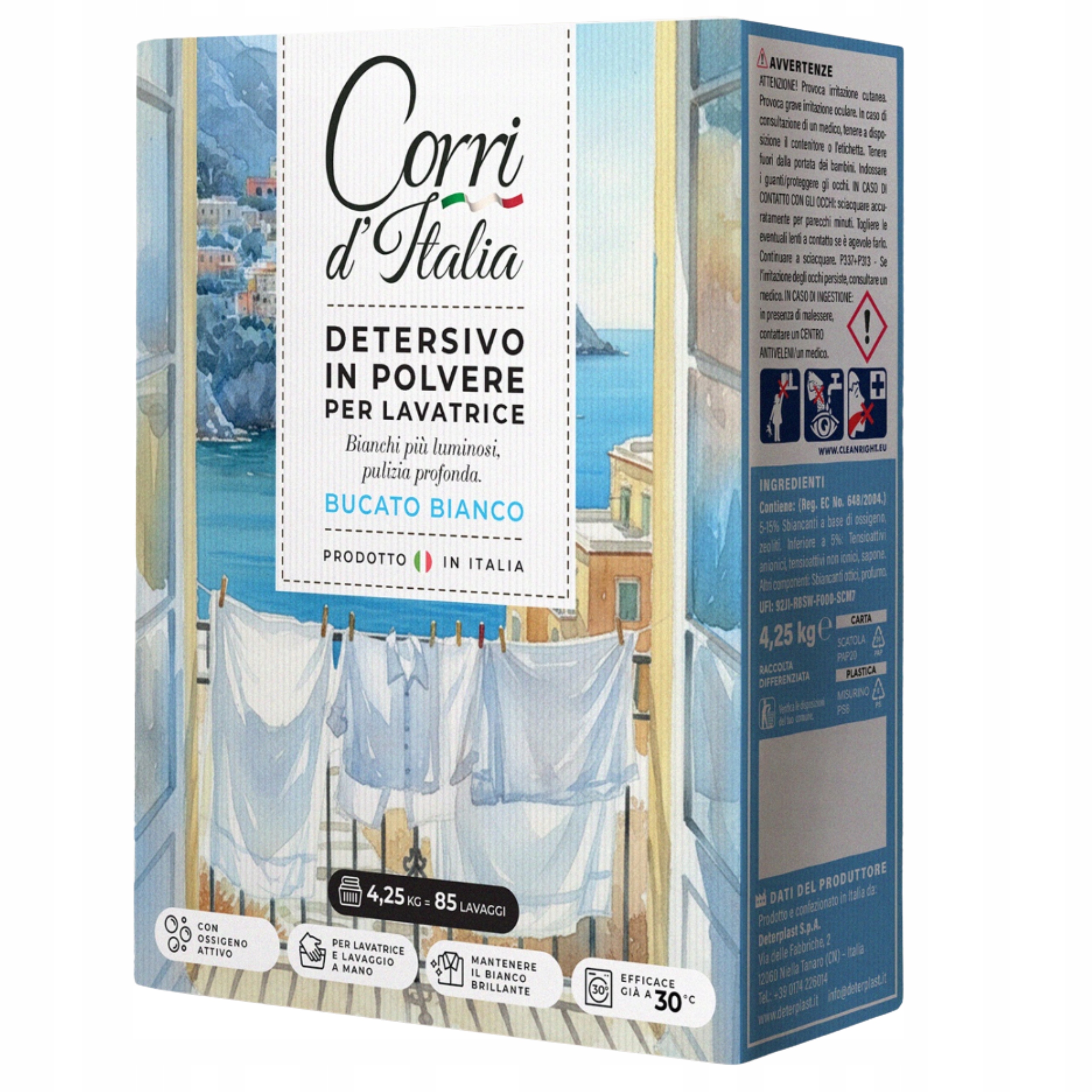 Corri d’Italia Bucato Bianco to wydajny, włoski proszek stworzony specjalnie do prania białych tkanin. Skutecznie usuwa zabrudzenia, pomaga zachować śnieżną biel ubrań i przywraca im świeży, czysty wygląd już od 30°C.
