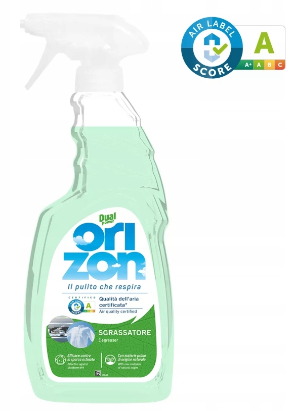 Posiadający certyfikat A by Air Label Score, odtłuszczacz Orizon łączy skuteczność i zrównoważony rozwój, dbając o jakość domowego powietrza i gwarantując niezwykłe rezultaty nawet w przypadku najbardziej uporczywych zabrudzeń, na wszystkich zmywalnych powierzchniach.