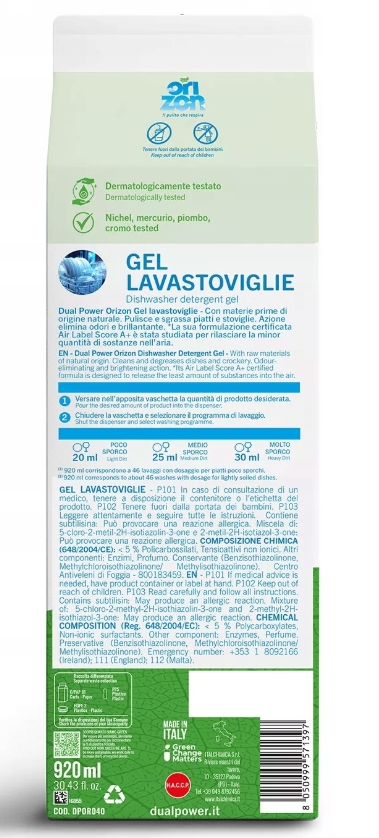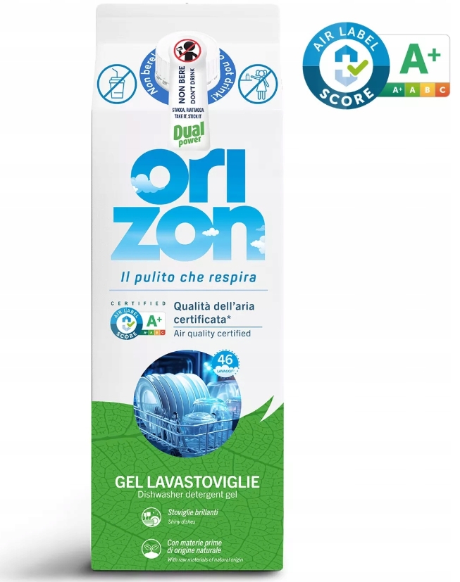 Żel do zmywarki Dual Power, posiadający certyfikat A+ Air Label Score, gwarantuje niską emisję substancji do powietrza w domu podczas korzystania z urządzenia i zapewnia idealnie odtłuszczone naczynia .