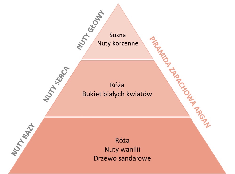 Orientalny, głęboki i intensywny zapach, w którym łączą się delikatne kwiatowe i drzewne akcenty. Intensywność i bogactwo perfumom nadaje bogaty ekstrakt z migdałów arganowych.