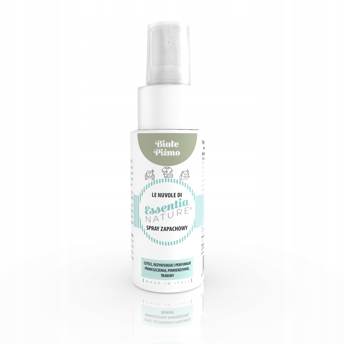 Skoncentrowane, włoskie perfumy do pomieszczeń i tkanin o działaniu odświeżająco-dezynfekującym.