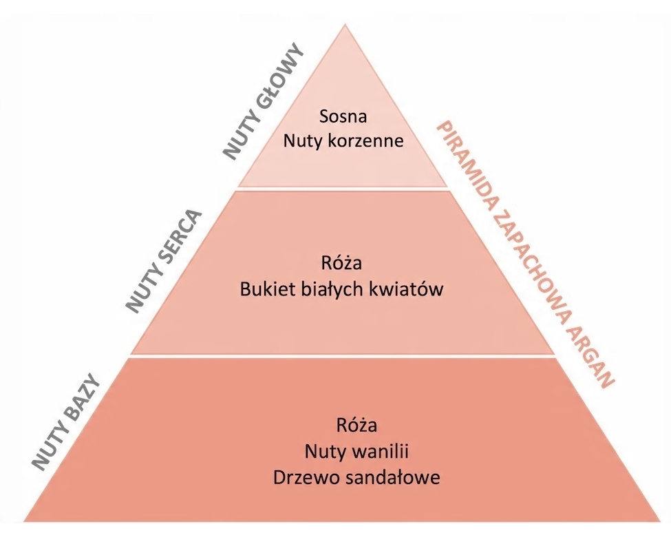 Orientalny, głęboki i intensywny zapach, w którym łączą się delikatne kwiatowe i drzewne akcenty. Intensywność i bogactwo perfumom nadaje bogaty ekstrakt z migdałów arganowych.