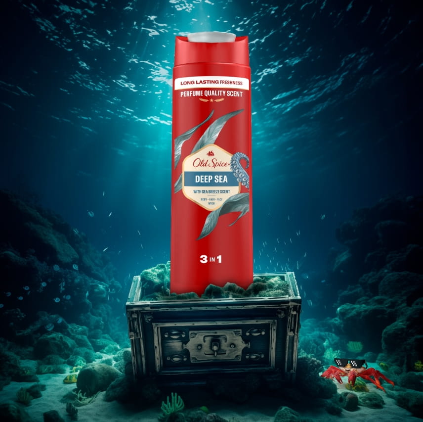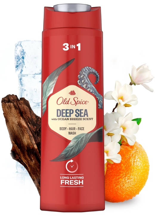 Żel pod prysznic i szampon dla mężczyzn Old Spice DEEP SEA myje skórę i uciera nosa nieświeżemu zapachowi.
