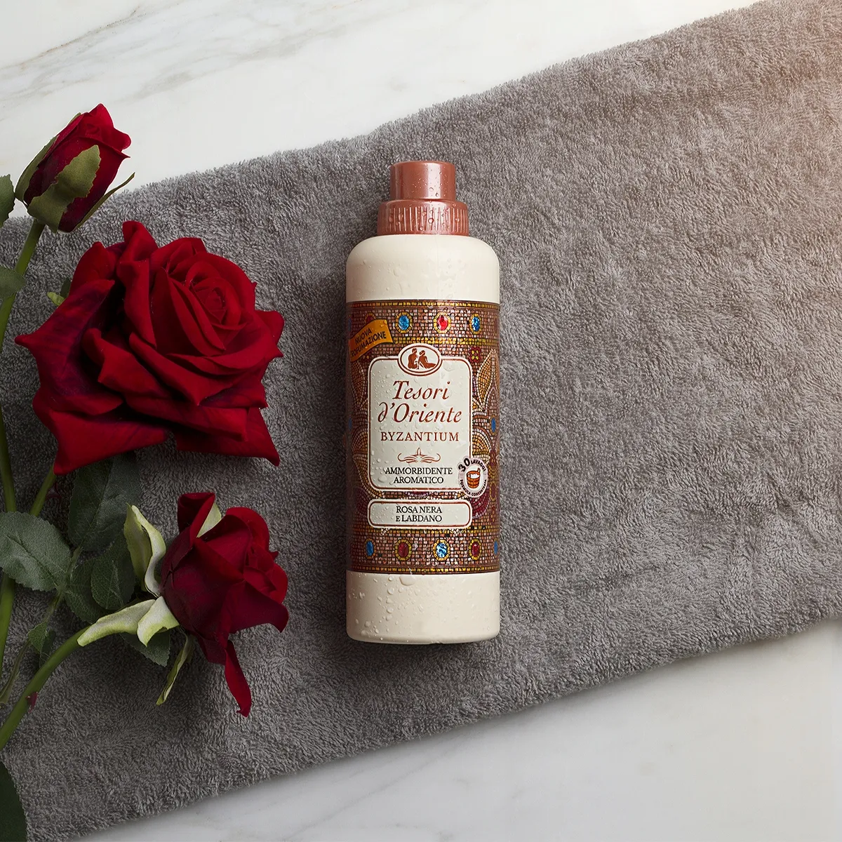 Płyn do płukania tkanin Tesori d'Oriente Byzantium to połączenie esencji czarnej róży i ciepłych nut labdanum. Labdanum to żywica z czystego drzewa, która od dawna była używana przez bizantyjskie kobiety do pielęgnacji skóry.