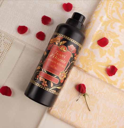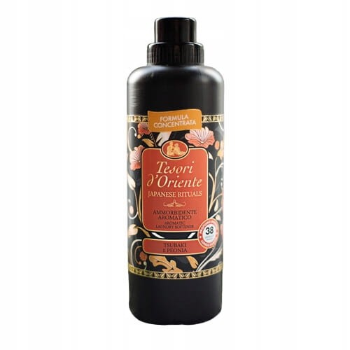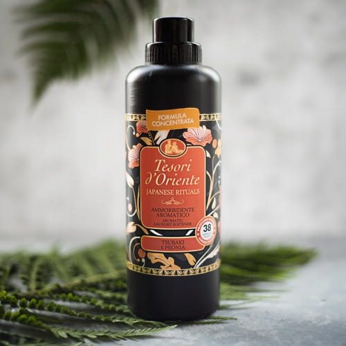 Płyn do płukania tkanin Tesori d'Oriente Japanese to intensywny i zmysłowy bukiet, wzmocniony naturalnymi i delikatnymi nutami olejku Tsubaki.