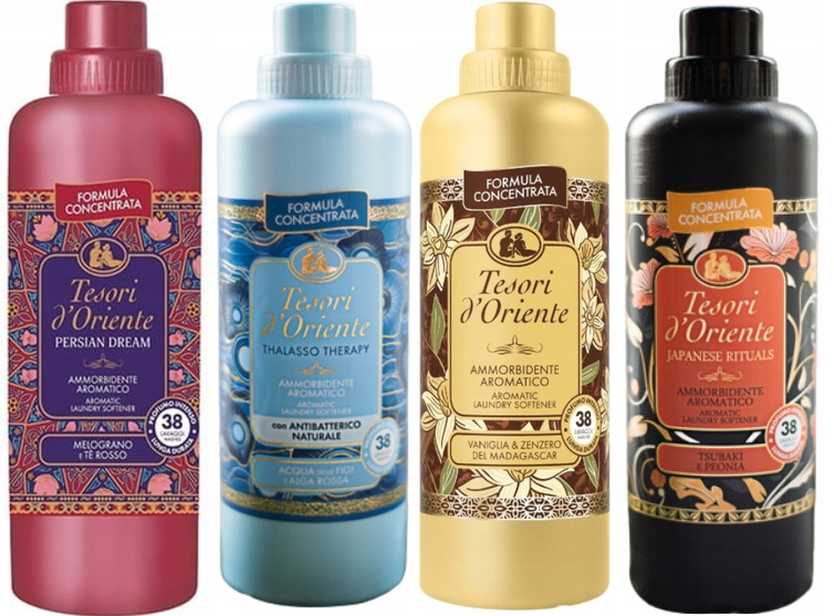 Koncentraty do płukania Tesori d'Oriente znane są z doskonałych zapachów i właściwości zmiękczających. Sprawiają, że ubrania pięknie pachną, są przyjemne w dotyku i łatwe w prasowaniu. Jest to możliwe dzięki zastosowaniu wysokiej jakości składników i aromatów.