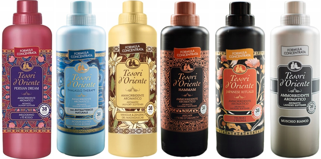 Koncentraty do płukania Tesori d'Oriente znane są z doskonałych zapachów i właściwości zmiękczających. Sprawiają, że ubrania pięknie pachną, są przyjemne w dotyku i łatwe w prasowaniu. Jest to możliwe dzięki zastosowaniu wysokiej jakości składników i aromatów.