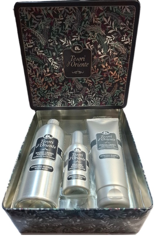 Zestaw prezentowy Tesori d’Oriente Muschio Bianco w eleganckim metalowym pudełku to klasyczna i ponadczasowa propozycja dla osób ceniących subtelne, czyste i wyrafinowane kompozycje zapachowe.