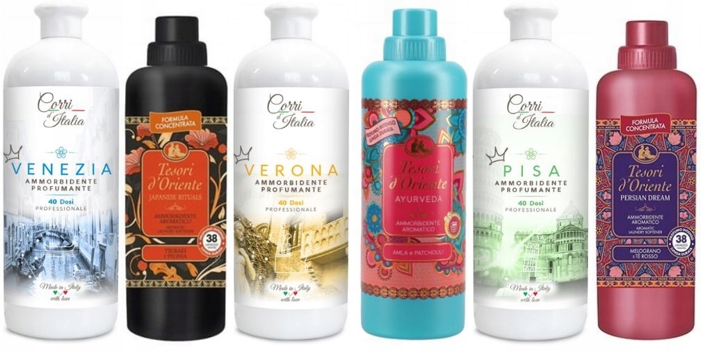 Koncentraty do płukania Tesori d'Oriente znane są z doskonałych zapachów i właściwości zmiękczających. Sprawiają, że ubrania pięknie pachną, są przyjemne w dotyku i łatwe w prasowaniu. Jest to możliwe dzięki zastosowaniu wysokiej jakości składników i aromatów.