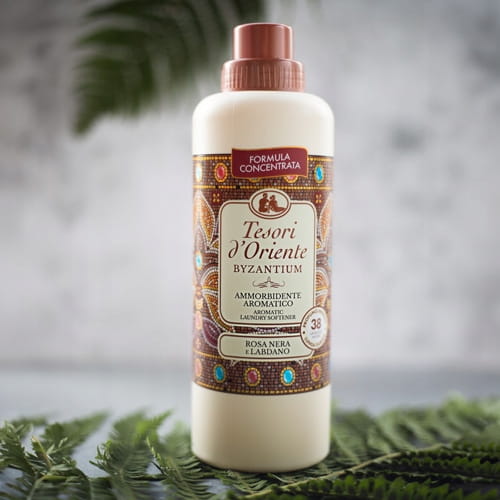 Skoncentrowane perfumy do płukania Tesori d'Oriente BYZANTIUM to aromatyczny kosmetyk, który otulaja zmysły i umysł ciepłymi nutami żywicy labdanum i czarnej róży, tworząc czarującą i wielowymiarową esencję, niczym cenna bizantyjska mozaika.Niezwykły zapach, który na długo utrzymuje się na płukanych tkaninach. Ubrania wypłukanie w perfumie Tesori d`Oriente stają się miękkie w dotyku. Jego kremowa formuła, wolna od barwników, rozluźnia tkaninę i ułatwia prasowanie.